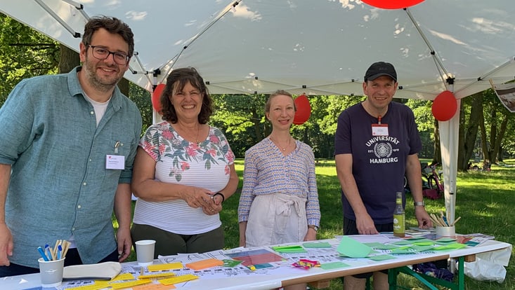 Das Team Co-Creation & Engagement stärkt die Präsenz der Universität im Quartier auch außerhalb des Campus, zum Beispiel bei den Stadteilfesten. Kern der Interaktionen im öffentlichen Raum ist immer, die Wahrnehmung der Universität als engagierte Nachbarin zu festigen, (lokal) relevante Themen und Expertisen zu identifizieren und Wissenschaft nahbar zu machen.