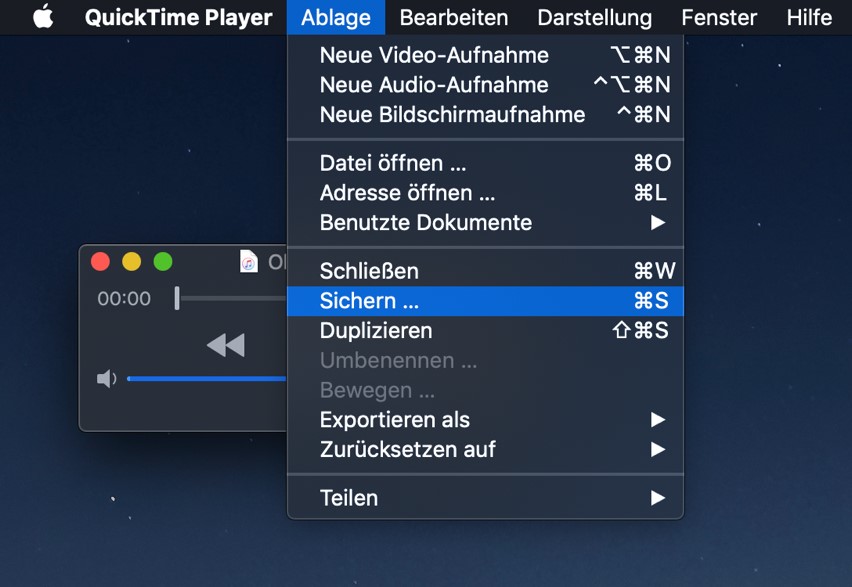 - Um die Aufnahme zu sichern, gehen Sie auf „Ablage“ -> „Sichern …“