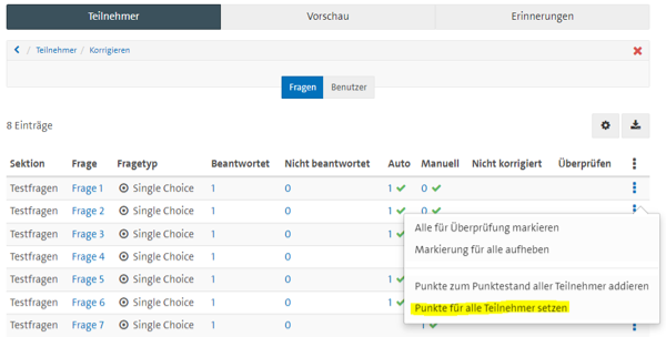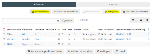 Übrigens: Via "Korrigieren" können Sie den Gesamt-Test auch "Frage-für-Frage" und nicht "Prüfling-für-Prüfling" korrigieren. Und mit den "Test Statistiken" können Sie die Prüfung als Ganzes analysieren.