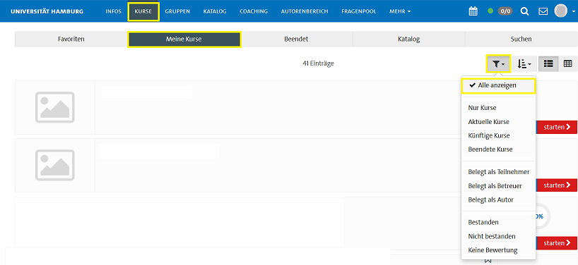 - Für Studierende: In der Kursübersicht gibt es verschiedene Filtermöglichkeiten. Überprüfen Sie, ob der korrekte Filter ausgewählt ist: