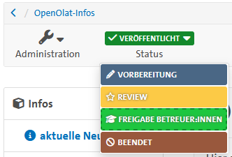 - Status des Kurses: Oftmals finden Teilnehmende einen Kurs nicht, da dieser noch den Status "Vorbereitung" trägt. Um den Status Ihres Kurses herauszufinden, gehen Sie in besagten Kurs und schauen Sie unter "Status" (zweites Icon oben links) auf den Status. Setzen Sie dann den Status auf "Veröffentlicht" und der Kurse kann gefunden werden.