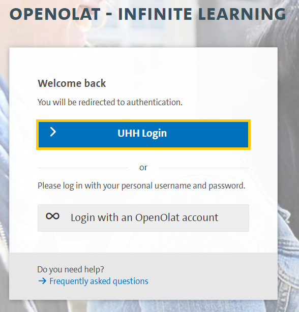 Kursbesitzende können über die Funktion Externes (nicht UHH) Mitglied einladen Personen in ihren Kurs einladen, die keine UHH-Kennung besitzen. Die eingeladenen Personen bekommen eine Benachrichtigung und können sich, wie im vorigen Anmeldeverfahren Mit Konto anmelden, in OpenOlat einloggen.