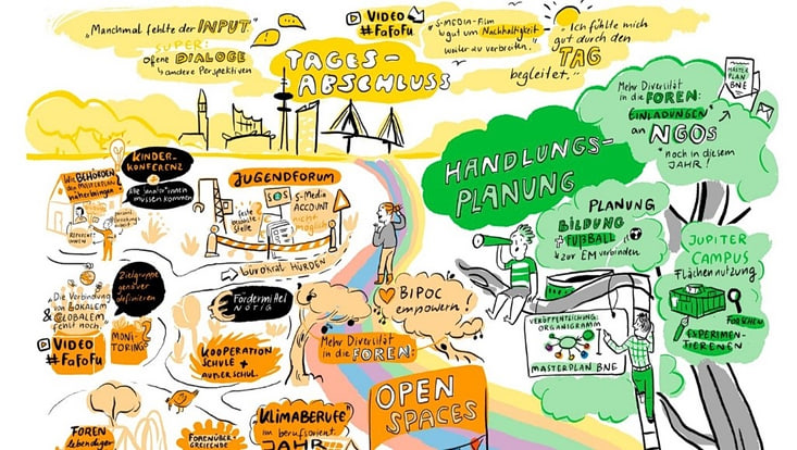 The Team Co-Creation & Engagement is actively committed to implementing the “Hamburg Masterplan Bildung für Nachhaltige Entwicklung 2030” (Masterplan Education for Sustainable Development 2030), which was adopted by the Senate of Hamburg in June 2021 and is led by the Authority for Environment, Climate, Energy, and Agriculture (BUKEA). Central to the Master Plan are approximately 100 measures developed across six "forums" focusing on early childhood, school-based, out-of-school, vocational and higher education, as well as on the administrative unit “districts”.