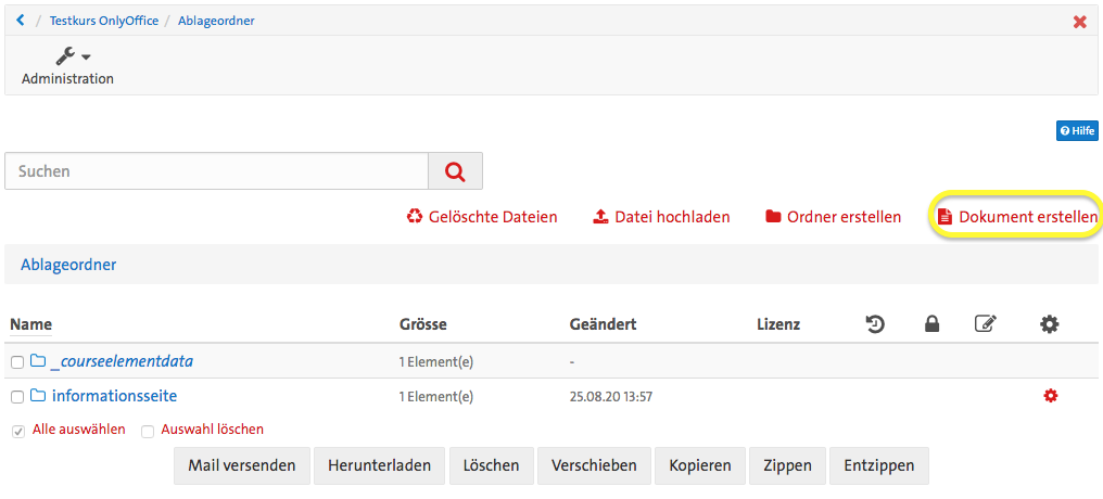 Attention: In the course editor under the Folder configuration tab, uploading must be enabled for participants in the respective folder under User permissions so that OnlyOffice can be used.