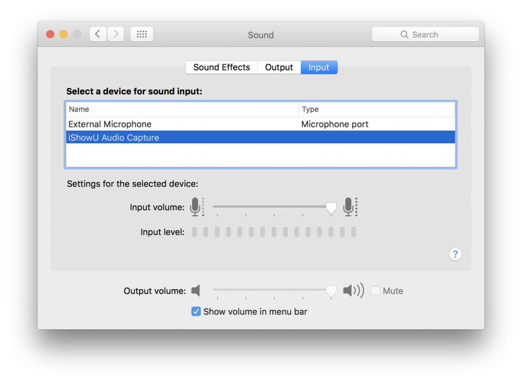 - Then open your sound settings (System Preferences > Sound) and select IShowU Audio Capture as the sound input.