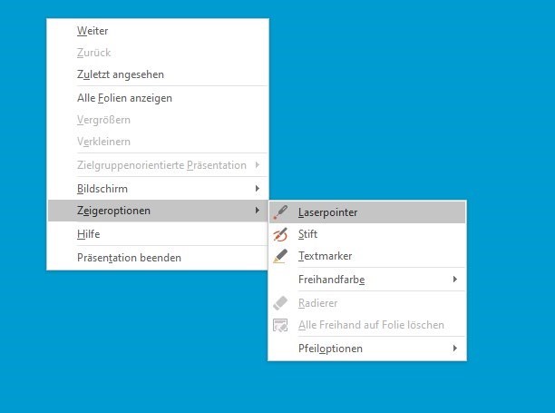 In addition to various pens and markers, the mouse can also be used as a laser pointer, whose movements will also be recorded. To do this, right-click and select the "Laser Pointer" option under "Pointer Options":