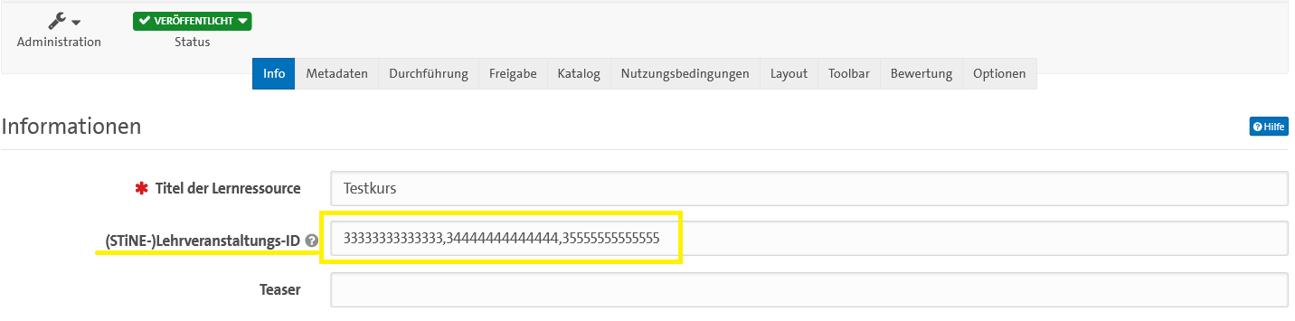 ➌ Copy the (STiNE) course event ID from STiNE in the row 'Event Details' in the gray bar on the right (e.g., 363605664619917) and paste this number in OpenOLAT under Administration -> Settings -> Info in the 'Identifier' field, and save your changes at the bottom of the page.