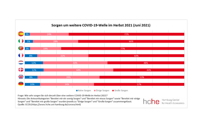 Even though the number of vaccinations is increasing and the incidence rate is going down, many people are concerned about the further development of the pandemic. “Within Europe, we are seeing a north-south divide,” explains Jona Schreyögg. The fear of further virus-mutations is particularly high in Spain and Portugal, with 96 and 97 percent respectively expressing disquiet. In Portugal, 75 percent of the population even admitted to being very or extremely worried. The numbers of those very or extremely worried in Germany were markedly lower at 87 and 51 percent, but 9 out of 10 say they are worried to some degree. The question as to whether there might be a fourth wave in the fall showed very similar results. Only 10 percent of those surveyed in Germany stated they were not worried, 57 percent in contrast are very or extremely worried. “Here as well, we see that the population is increasingly worried, from Denmark down to the Mediterranean.” points out Schreyrögg.