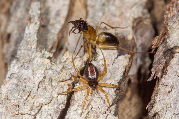 The analyses showed that the hunt occurs in two phases. The first phase is a kind of acrobatic attack, in which the spider attaches a strand of silk to the tree, then launches itself over the ant’s body, landing on the other side. They pull the silk strand from their spinnerets with their hind legs while jumping, attaching it to the ant in the process. In the second phase, the spider circles the ant, further entangling it in sticky silk, before then delivering a toxic bite. Finally, the ant is hauled away for consumption, often dangling by a silk thread.