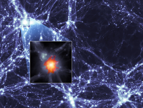 When viewed from a great distance, mass in the universe is not evenly distributed but resembles a net-like structure referred to as the cosmic web. There are often thousands of galaxies at the nodes of the cosmic web. After the big bang, the collision of such galaxy clusters is considered one of the most powerful astronomical events. During such collisions, tiny charged particles are accelerated almost to the speed of light. This produces radio radiation, which can be measured with special telescopes.