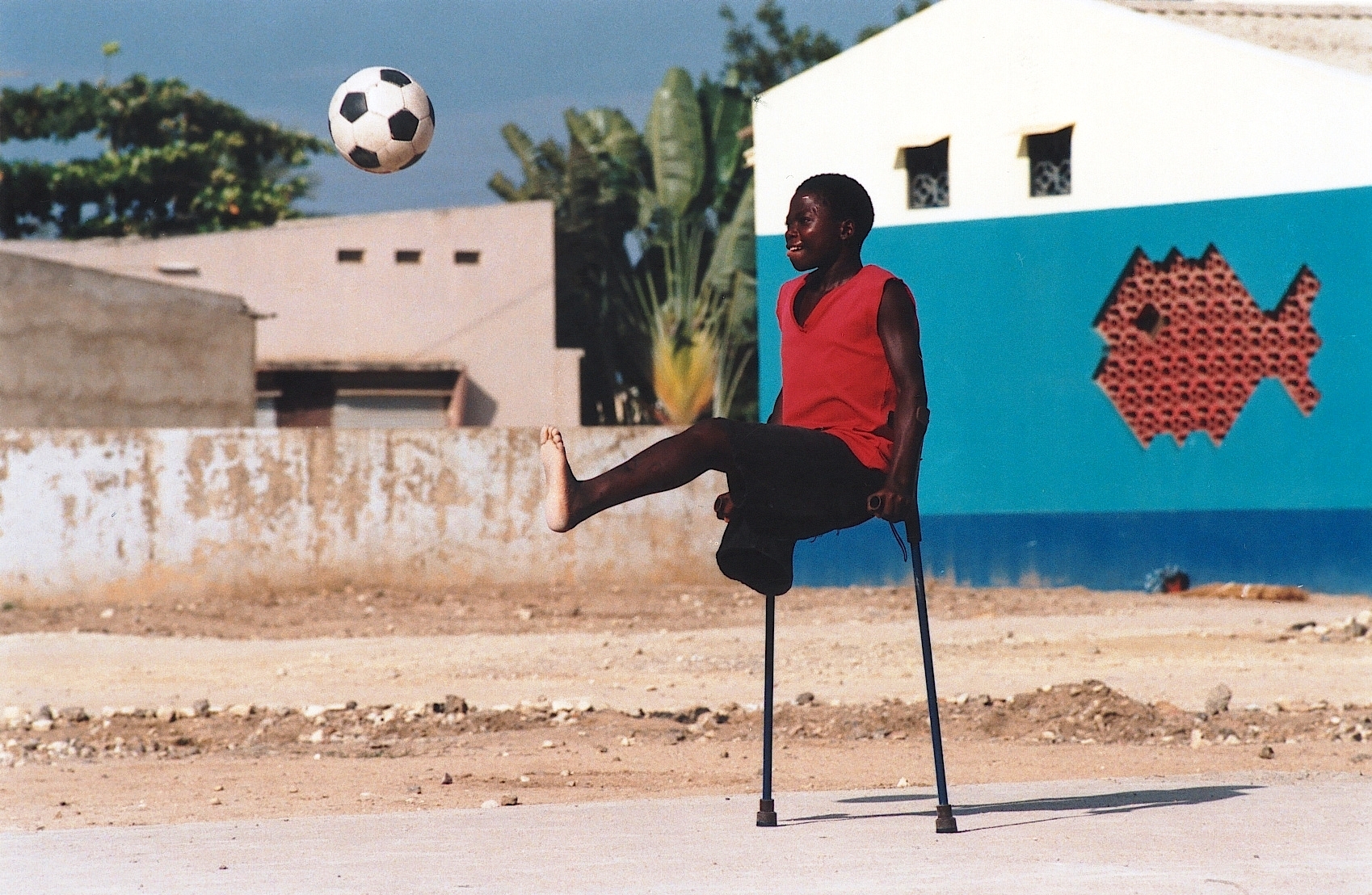Ein angolanisches Minenopfer beim Fußballspielen.