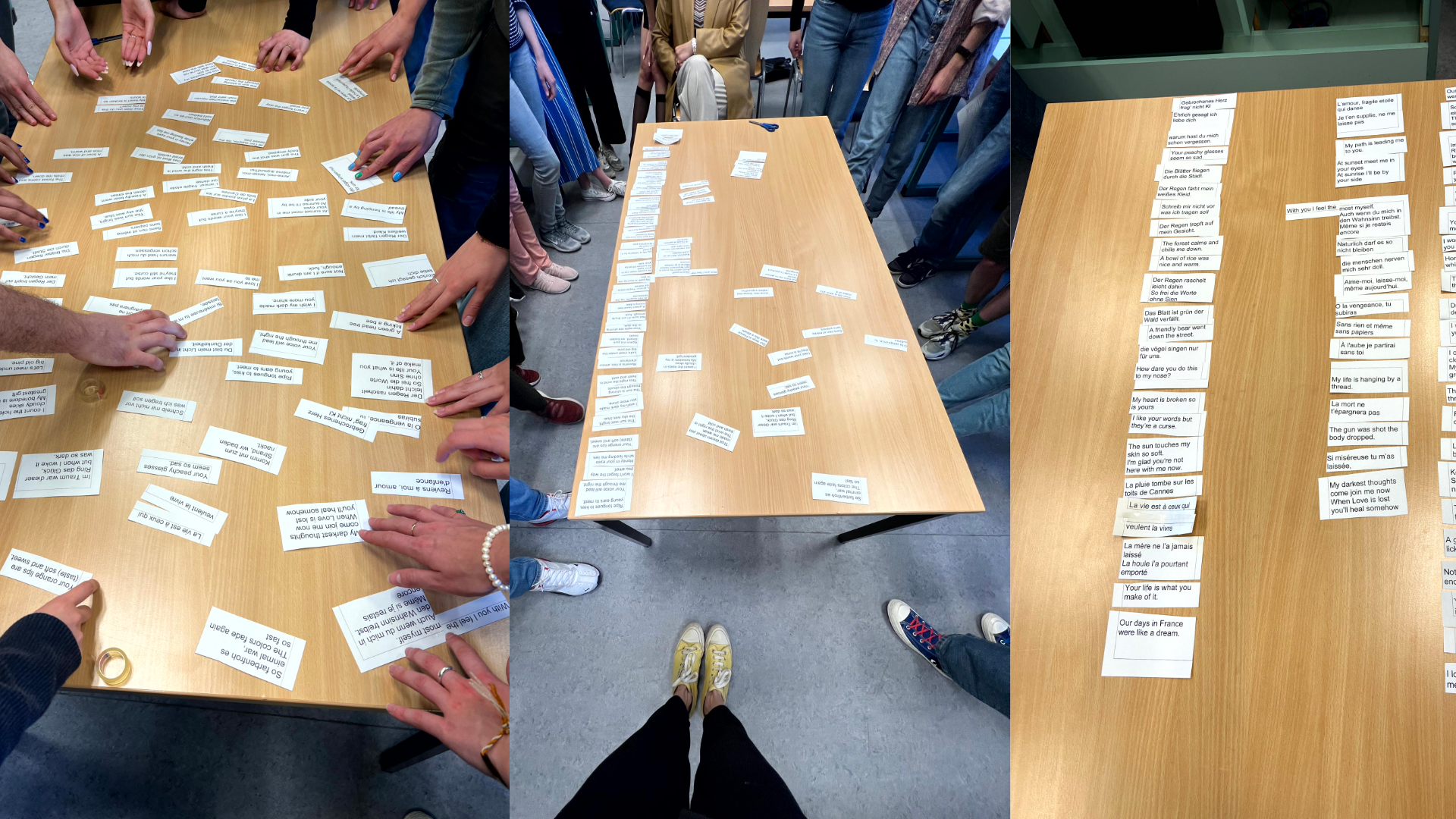 Als Abschlussprojekt entschieden wir uns, ein Liebesgedicht in allen drei Sprachen zu schreiben. Die Bilder zeigen die letzten Phasen unseres Schreibprozesses, in dem wir die verschiedenen Zeilen auf kleine Zettel schrieben und unsere Liebesgeschichte entstehen ließen. Dieses Gedicht und dieses Projekt nennen wir: Dreisprachige Liebe.