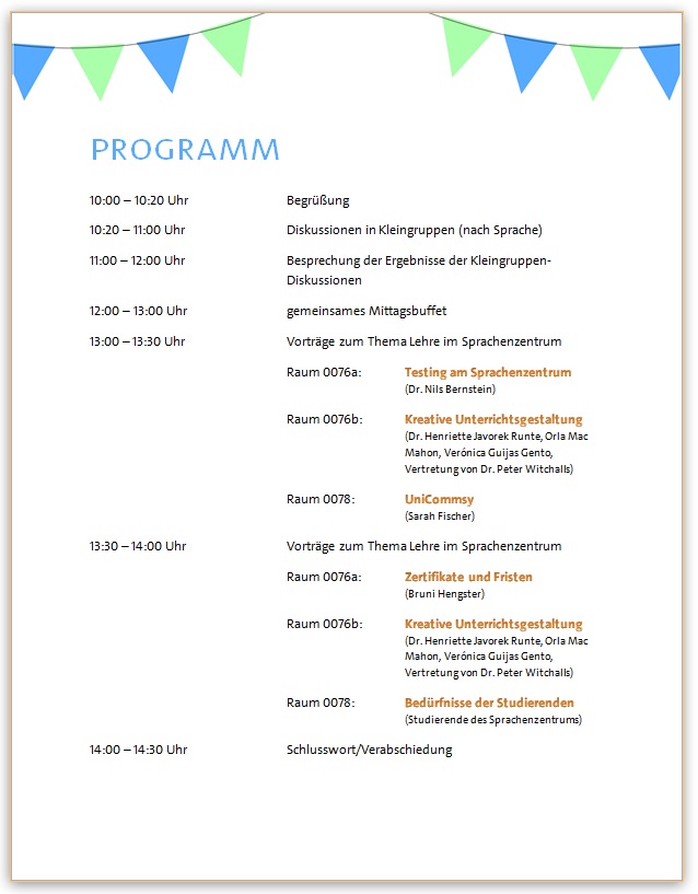In diesem Workshop möchten wir zunächst gemeinsam die Bedürfnisse der Sprachgruppen ermitteln, um zu überprüfen, ob die Strukturen für alle Sprachen passend sind. Dann wird es ein abwechslungsreiches und interessantes Vortragsprogramm geben. Die Vorträge dauern alle ca. eine halbe Stunde und beschäftigen sich mit Themen rund um das kreative Lehren von Sprachen, den Umgang mit der Technik (UniCommsy) und auch die Studentenperspektive wird nicht zu kurz kommen.