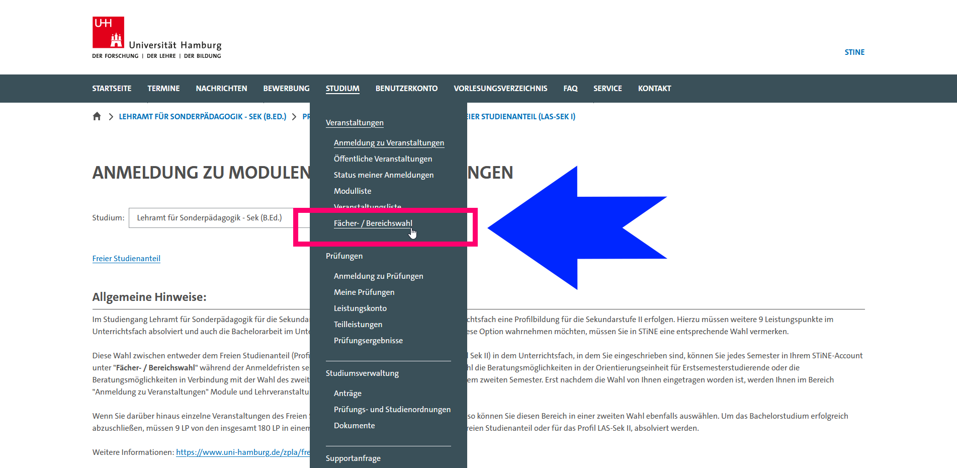 Die Wahl entweder für das Profil Sekundarstufe I mit dem Freien Studienanteil oder stattdessen für das Profil Sekundarstufe I und II mit fachlichen Vertiefungsmodulen im eingeschriebenen Unterrichtsfach erfolgt vor der Anmeldung zu den zugehörigen Lehrveranstaltungen. Die Profilwahl ist jedes Semester innerhalb der Anmeldefristen (und darüber hinaus) in STiNE eintragbar. Dazu melden Sie sich in Ihrem STiNE-Account an und tragen Ihre Entscheidung unter "Studium" in der "Fächer- / Bereichswahl" ein. Das gewählte Profil wird sodann im Leistungskonto angezeigt und anschließend kann die Anmeldung zu Lehrveranstaltungen erfolgen.